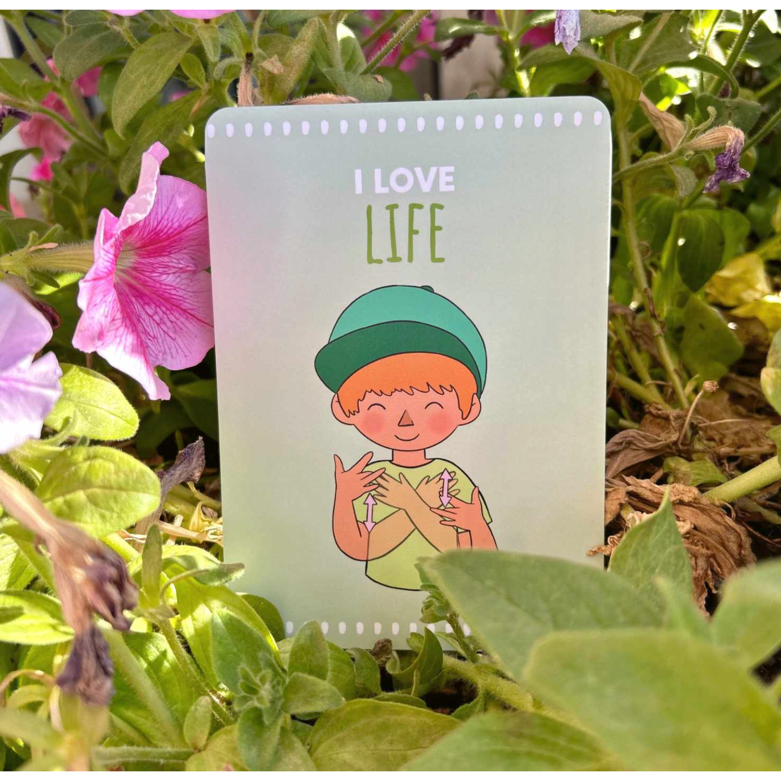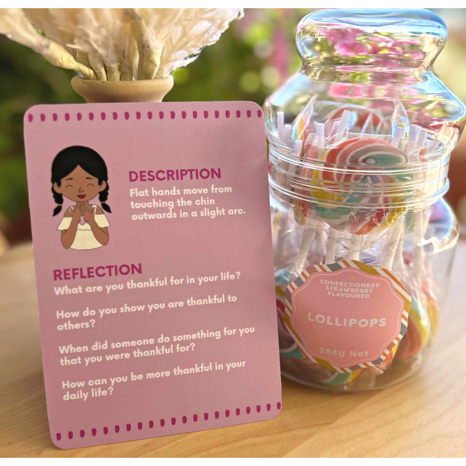 Please note that the images on the cards provide a general understanding of the handshapes and movements required for signing different affirmations in Auslan. For accurate and culturally appropriate communication in Auslan, it is recommended to cross-reference these signs using local community resources.