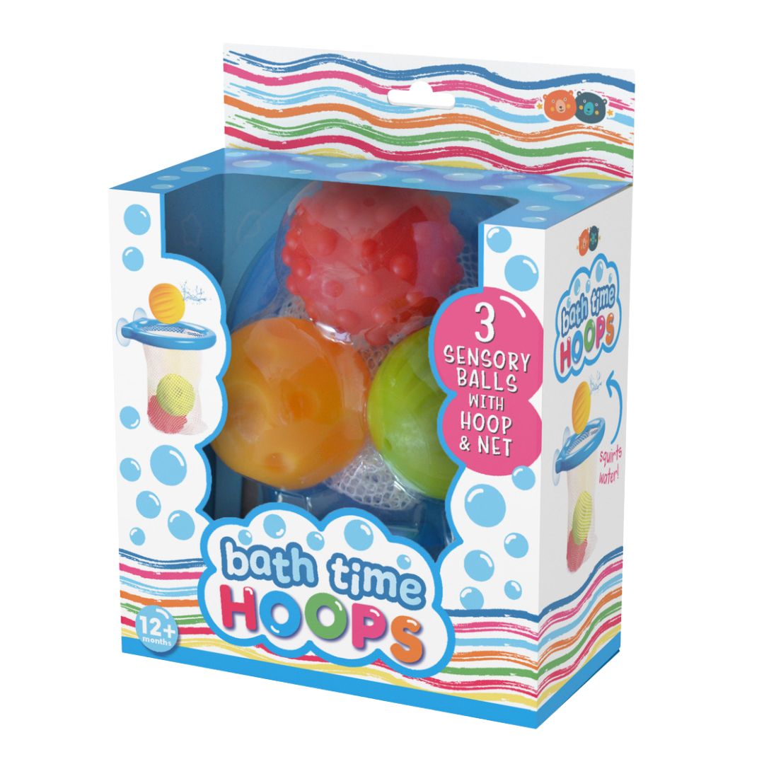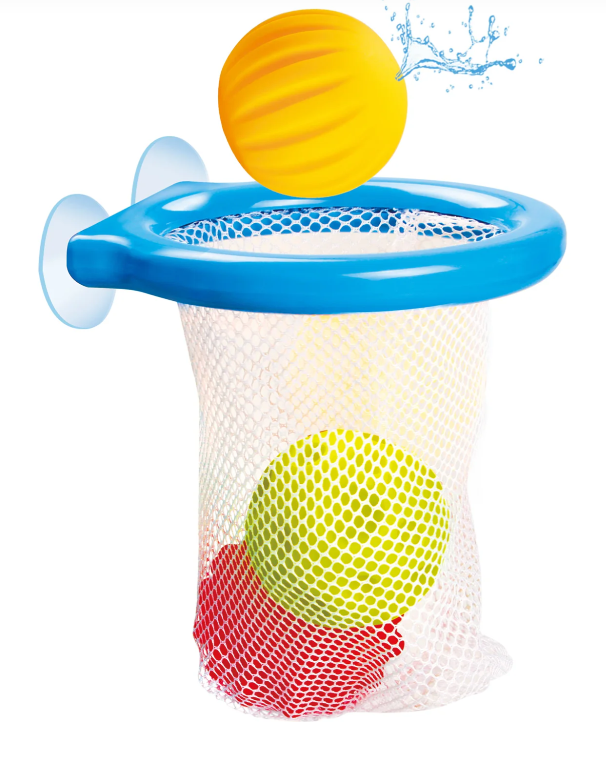 The set includes three vibrant, interactive sensory balls that fill with water and squirt when squeezed, adding a sensory twist to bath time. The hoop and net create the perfect challenge, helping your child develop hand-eye coordination and motor skills while they play.