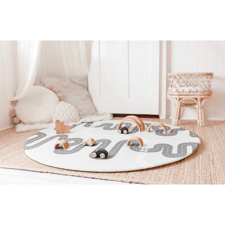 This is the new playmat combination put together from two of Grace and Maggie Playmats best selling prints! The Boho / Baby Driver is a reversible playmat that ticks all the boxes for the most stylish of play spaces. With the look of a round decorative rug, the safety features of a waterproof activity mat, a cushiony soft feel for sensory input, and the best part- a reversible side with road and train tracks!