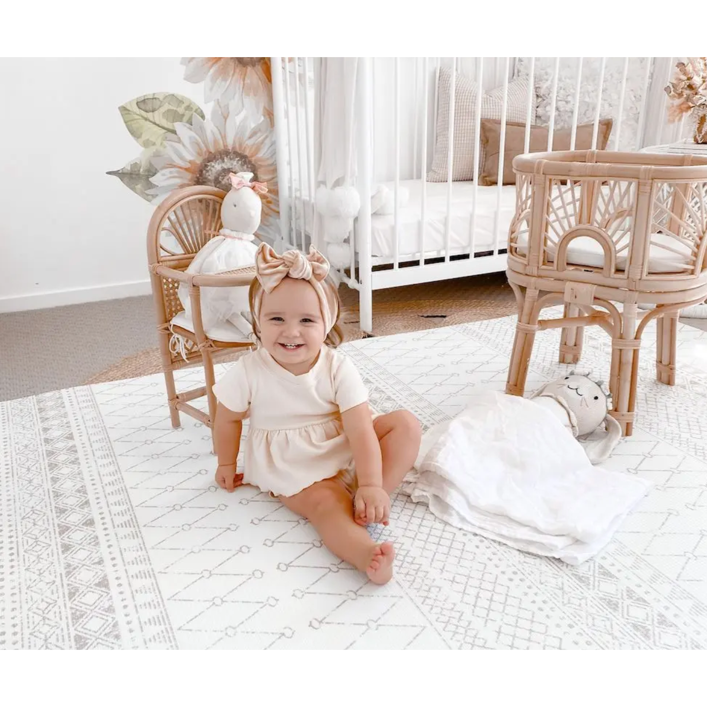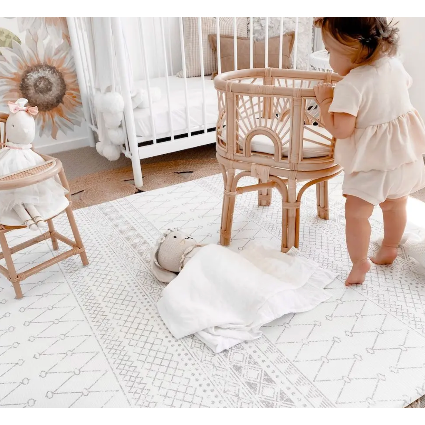 On side A there's a neutral boho vintage design, that will suit any living space. With warm grey and off white undertones, this playmat will blend seamlessly with your space and complement most colour palettes. Inspired by my love of bohemian style and scandi versatility, this pattern has a distressed look that is soft enough for a contemporary modern space or a relaxed bohemian backdrop.