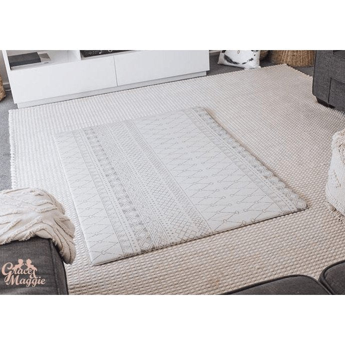 Side A has a neutral boho vintage design that will suit any living space. On the boho side - choose between a white/cream colour or a light grey tone. This playmat will blend seamlessly with your space and complement most colour palettes. Inspired by Grace and Maggie's love of bohemian style and scandi design, this pattern has a distressed look that is soft enough for a contemporary modern space or a relaxed bohemian backdrop.