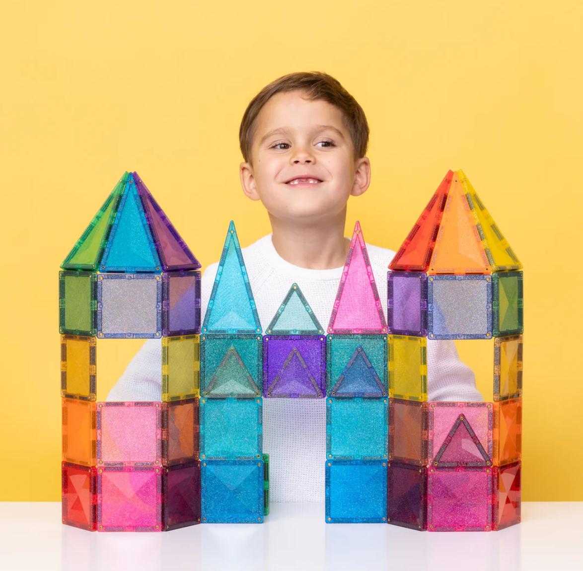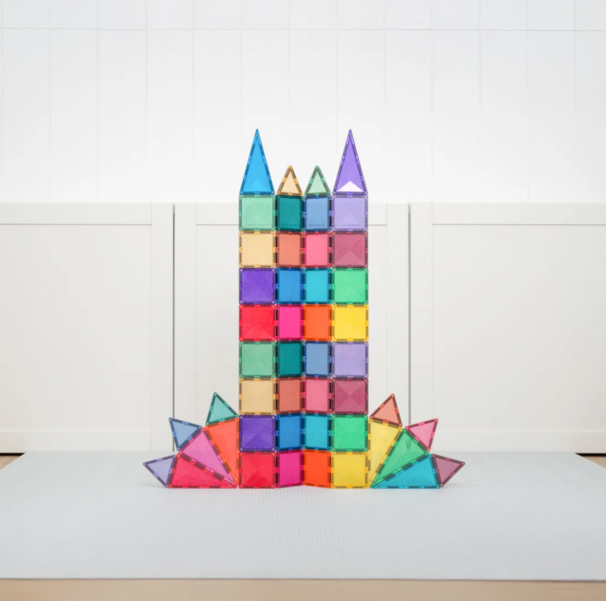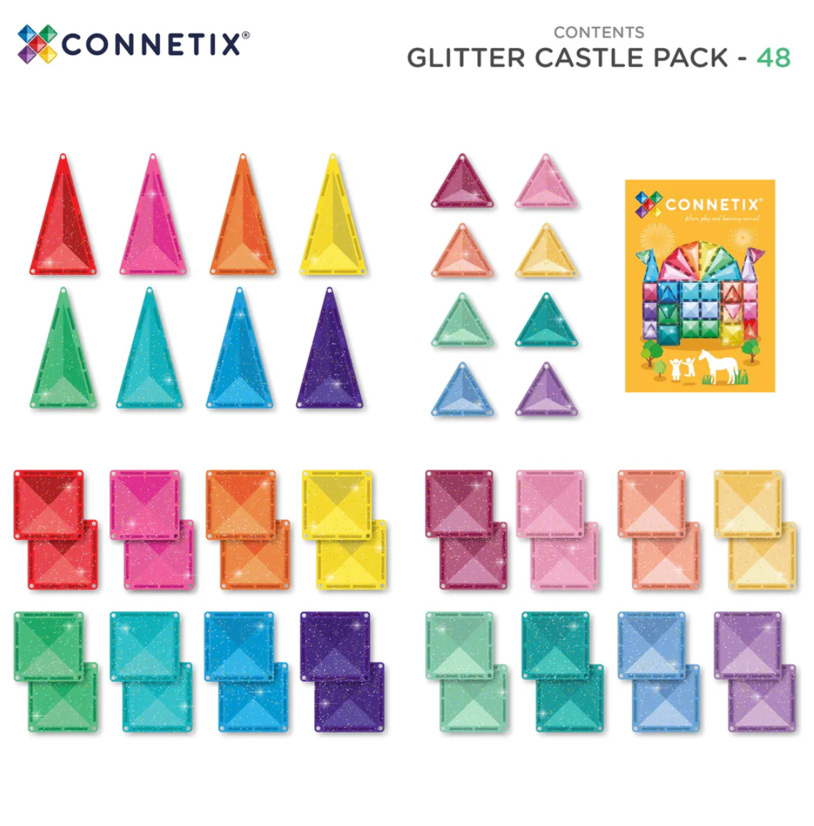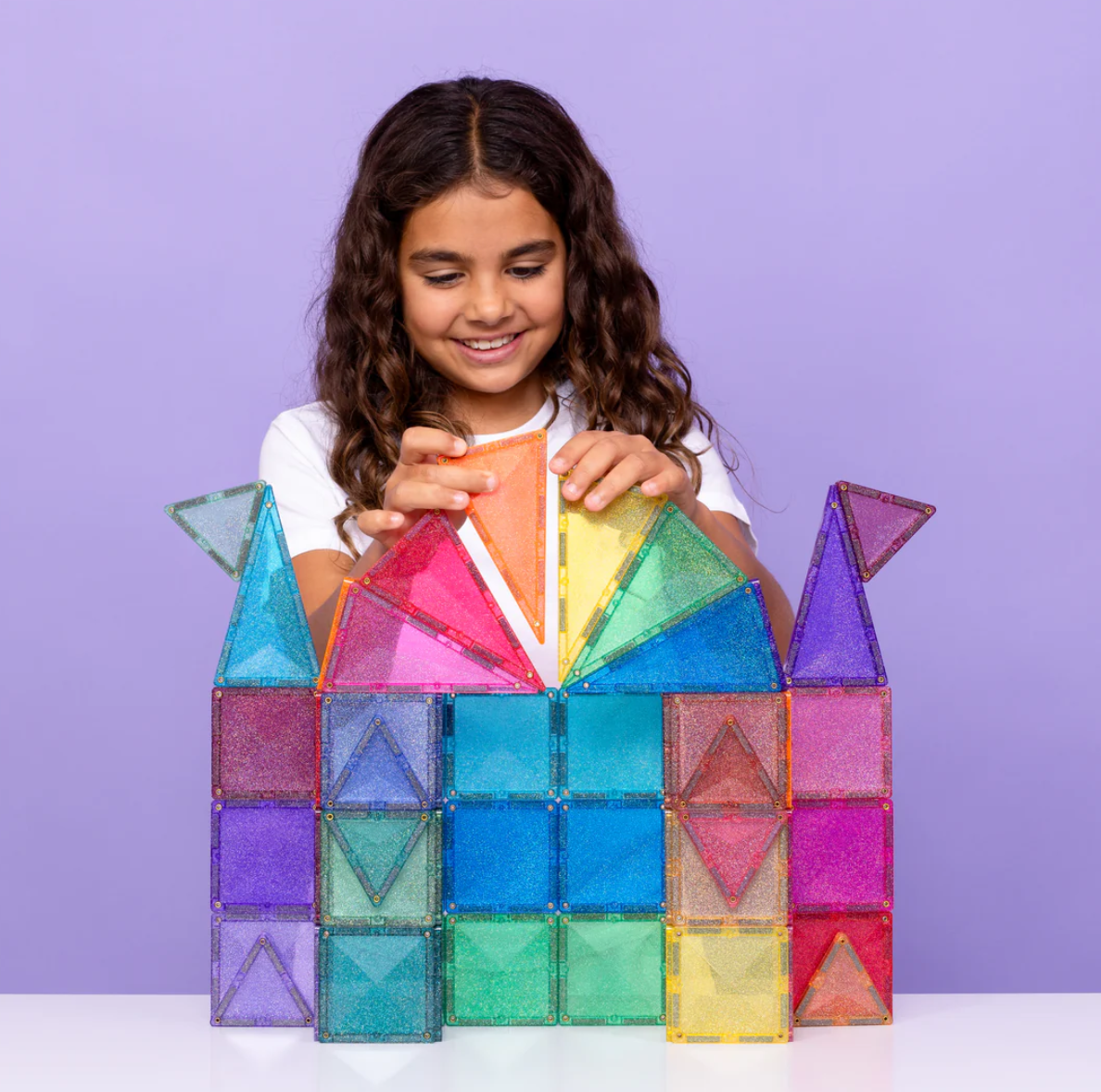 Designed for big imaginations and fairytale explorers, our stunning glitter tiles in signature pastel and vibrant rainbow colours add a touch of magic to every build. Featuring squares, plus a mix of isosceles and equilateral triangles all bursting with multi-coloured sparkles, this open-ended pack is perfect for building shimmering castles, towers, bridges, animals and so much more!