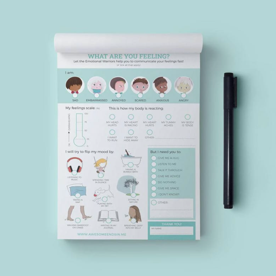 Learning how to recognise your feelings and how they feel in your body is the theme of the Emotional Warriors products. This handy, easy to fill out notepad will make communicating that fast, and in turn teach children how to recognise and acknowledge those feelings, allowing them to pass by.