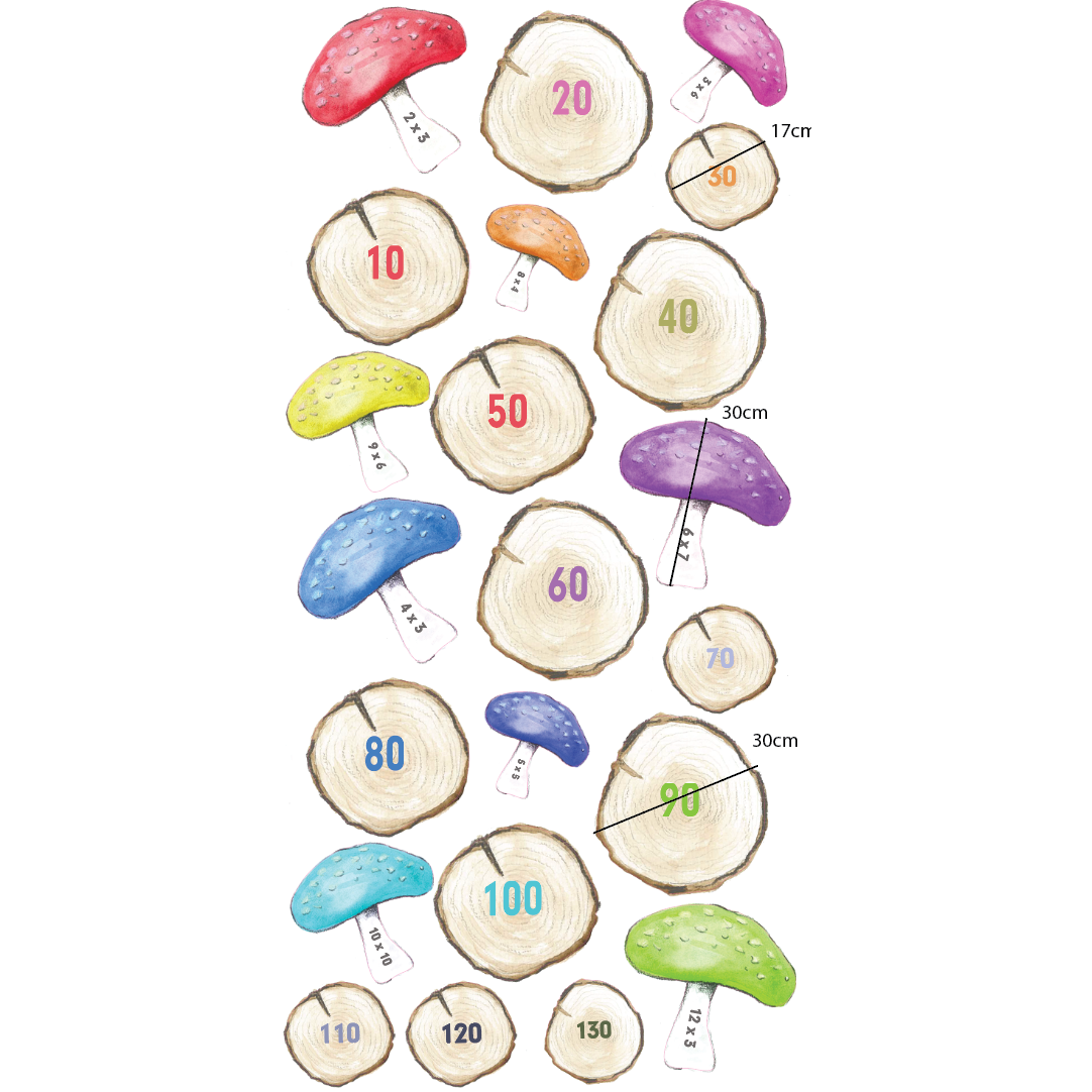- 21 pieces - logs with numbers and colourful toadstools of differing sizes