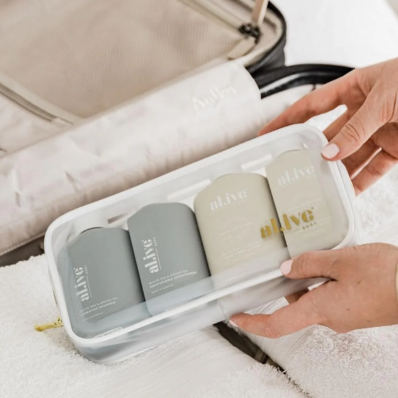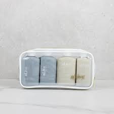 All encased in a practical travel case, this set of 4 products makes it easy to travel in style, or also perfect size for any hospital visit stays.