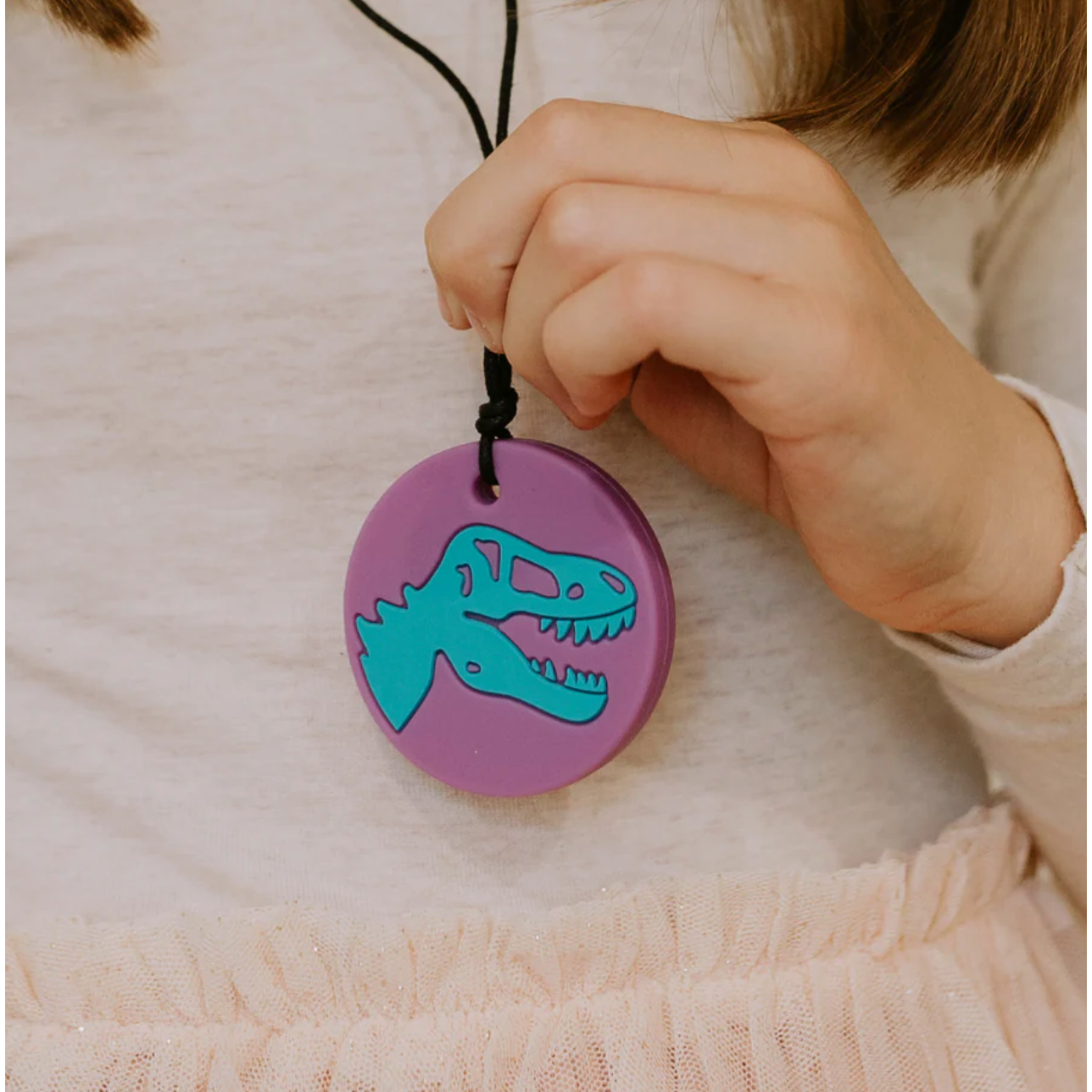 The silicone dinosaur pendant on this necklace is recommended by Occupational Therapists as a tool your child can use independently to develop effective control of their nervous system responses, promoting a sense of calm emotional regulation.