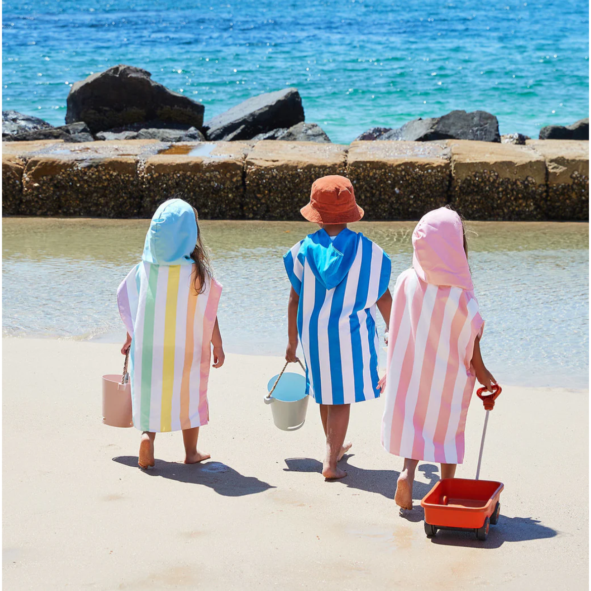 Keep kids warm and sand-free after a splash in the sea or pool with a super comfy and colourful poncho hooded towel.