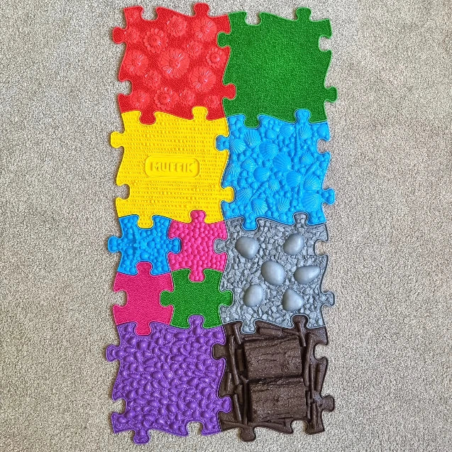 Discover the perfect combination of sensory play and therapeutic support with the Large 1 Waterproof Tactile Sensory Floor Mat Set by Muffik. This 16-piece set blends SOFT and FIRM tactile surfaces that simulate the feeling of walking barefoot in nature - stimulating and strengthening your feet and core muscles in a fun, creative way.