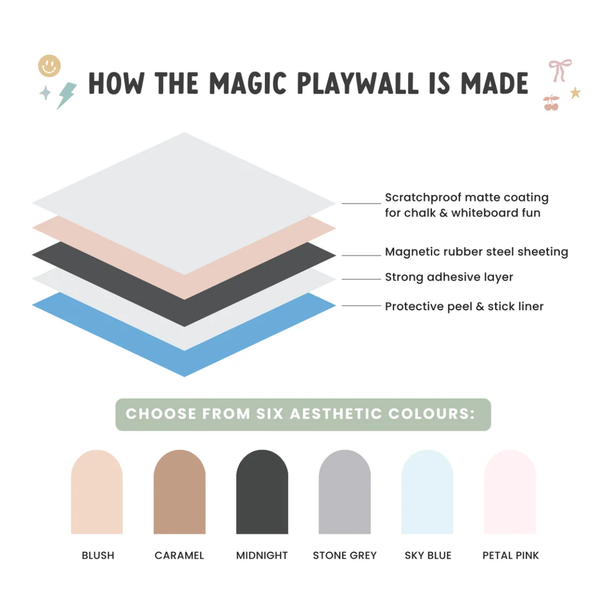 The Magic Playwall is a multi-purpose, magnetic, art and chalkboard canvas disguised as an aesthetically beautiful wall decal. Transform your walls into the ultimate canvas of creativity for hours of open-ended, play-based fun!